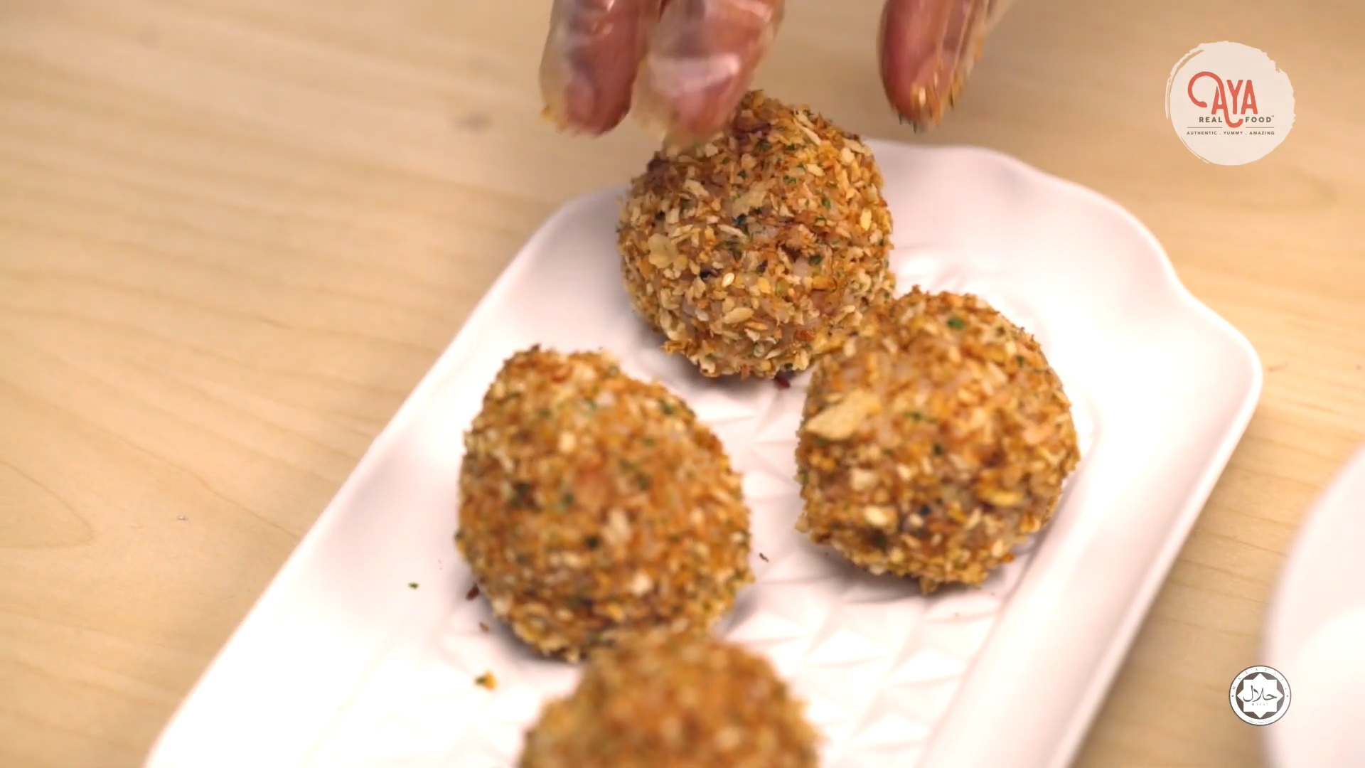 Shape the prepared sticky rice into a mini ball size. Then, cover the sticky rice ball prepared with the breadcrumbs prepared earlier.
